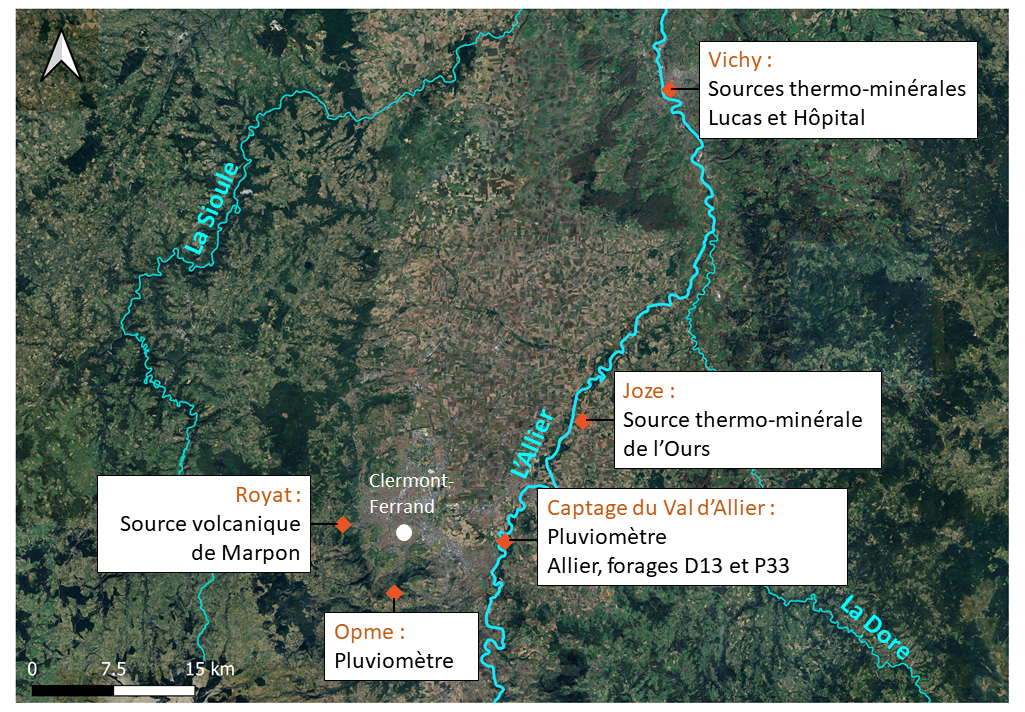 AUVERWATCH comprend actuellement neuf stations de mesures localisées sur la plaine de la Limagne incluant des forages en nappe alluviale (champ captant de Clermont-Ferrand, dit du « Val d’Allier »), des points de mesure en rivière et dans diverses sources volcaniques (Marpon) et thermominérales (Ours et Vichy), ainsi que des pluvio-collecteurs. Ces stations sont suivies du point de vue de l’hydrodynamique (des capteurs CTD mesurent au pas de temps horaire les variations de niveau, la température et la conductivité électrique de l’eau) et de la physico-chimie via des prélèvements mensuels en vue de l’analyse de 100 à 500 paramètres (chimie des éléments majeurs, chimie organique, isotopes stables de la molécule d’eau et microbiologie), variables selon les sites. Les sites instrumentés permettent par ailleurs la mise en place d’expérimentations transdisciplinaires sur la nappe alluviale, associant hydrogéologie, hydrochimie, géophysique, et mesures distribuées de températures par fibre optique (Raman, Brillouin).